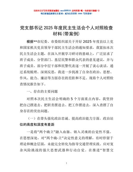 / 党支部书记2025年度民主生活会个人对照检查材料(带案例)