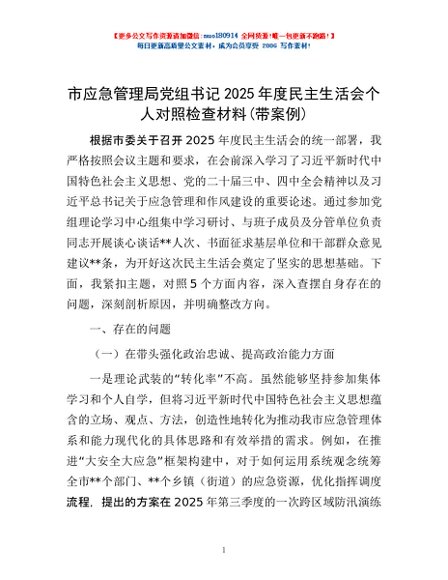 / 市应急管理局党组书记2025年度民主生活会个人对照检查材料(带案例)