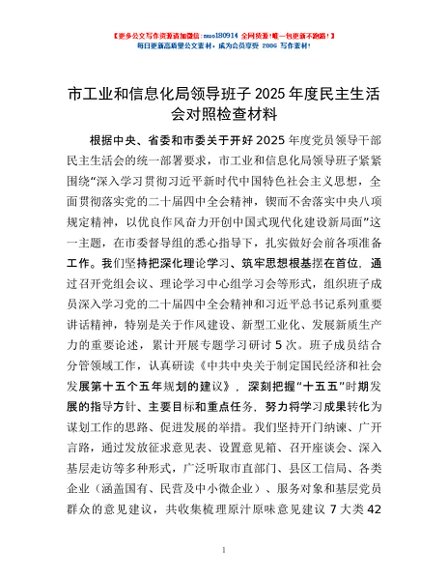 / 市工业和信息化局领导班子2025年度民主生活会对照检查材料