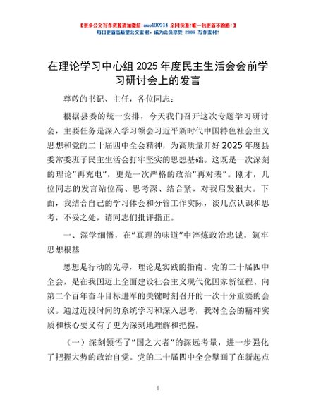 / 在理论学习中心组2025年度民主生活会会前学习研讨会上的发言