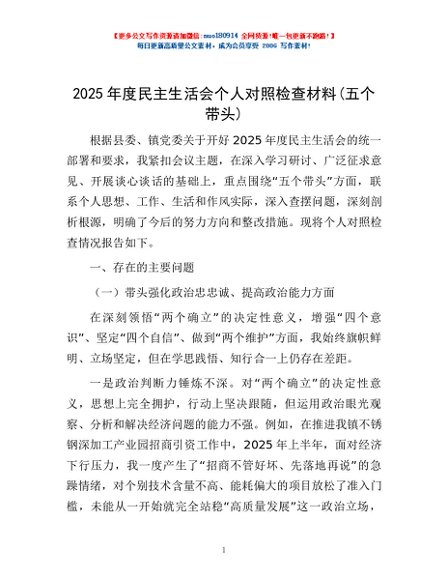 / 2025年度民主生活会个人对照检查材料(五个带头)