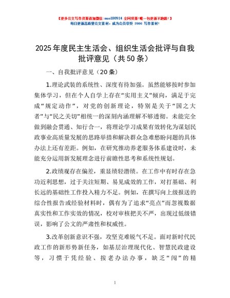 / 2025年度民主生活会、组织生活会批评与自我批评意见(共50条)