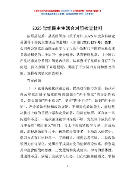 / 2025党组民主生活会对照检查材料
