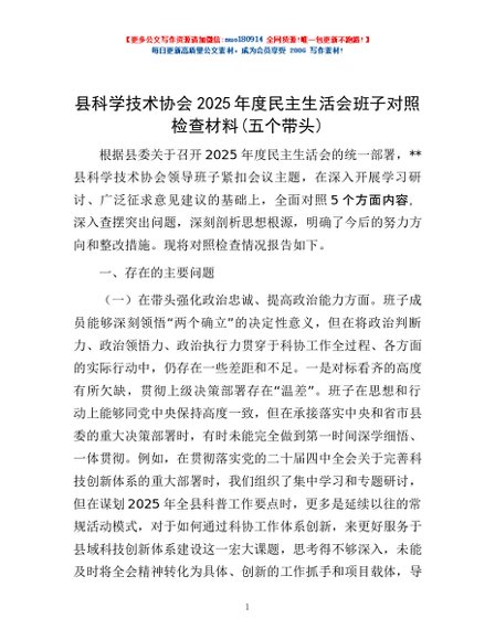 / 县科学技术协会2025年度民主生活会班子对照检查材料(五个带头)