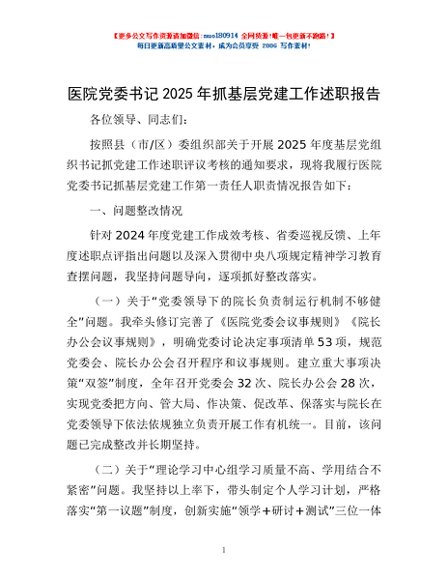 / 医院党委书记2025年抓基层党建工作述职报告