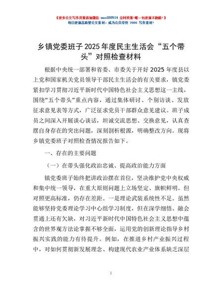 / 乡镇党委班子2025年度民主生活会“五个带头”对照检查材料
