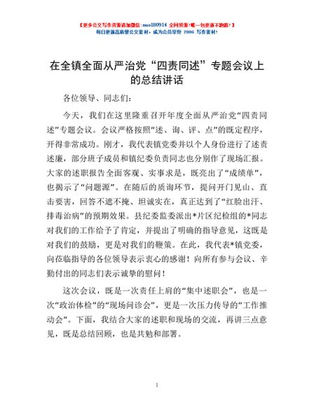 / 在全镇全面从严治党“四责同述”专题会议上的总结讲话