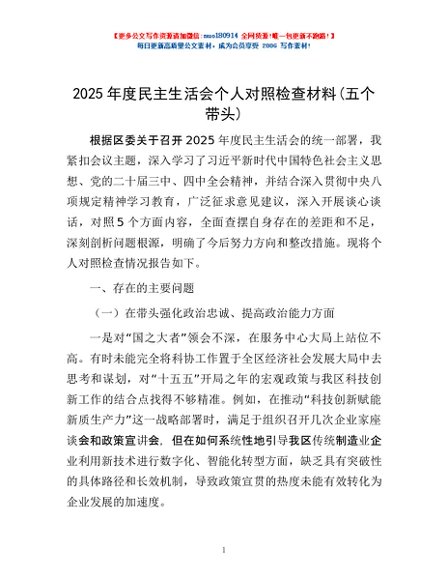 / 2025年度民主生活会个人对照检查材料(五个带头)