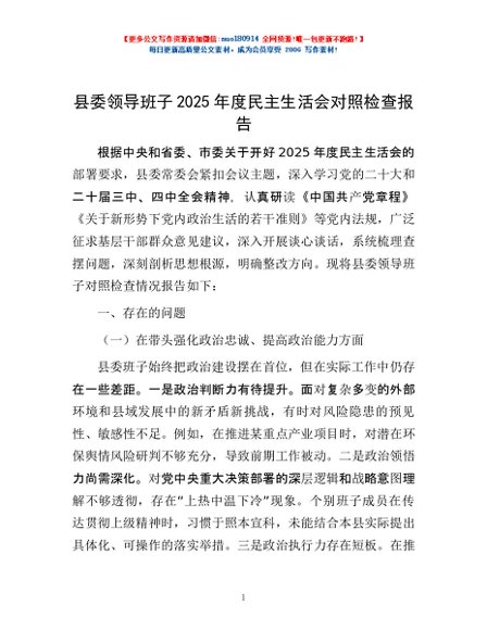 / 县委领导班子2025年度民主生活会对照检查报告