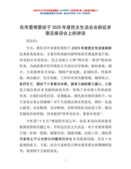 / 在市委常委班子2025年度民主生活会会前征求意见座谈会上的讲话