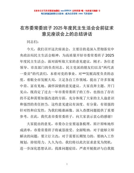 / 在市委常委班子2025年度民主生活会会前征求意见座谈会上的总结讲话