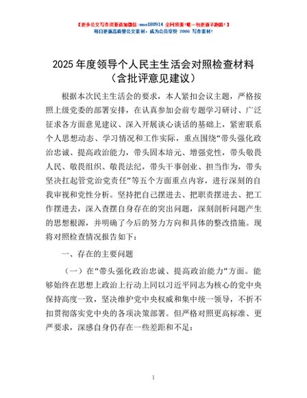 / 2025年度领导个人民主生活会对照检查材料(含批评意见建议)