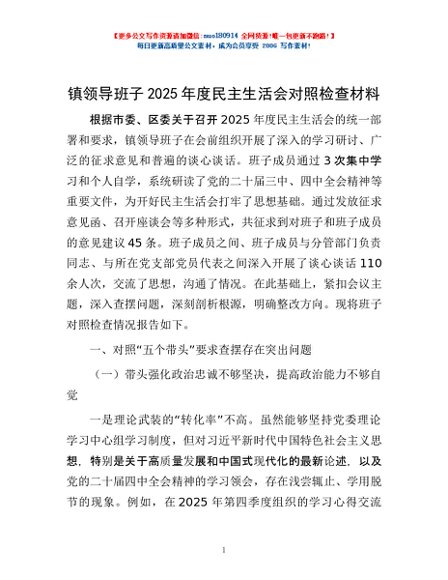 / 镇领导班子2025年度民主生活会对照检查材料
