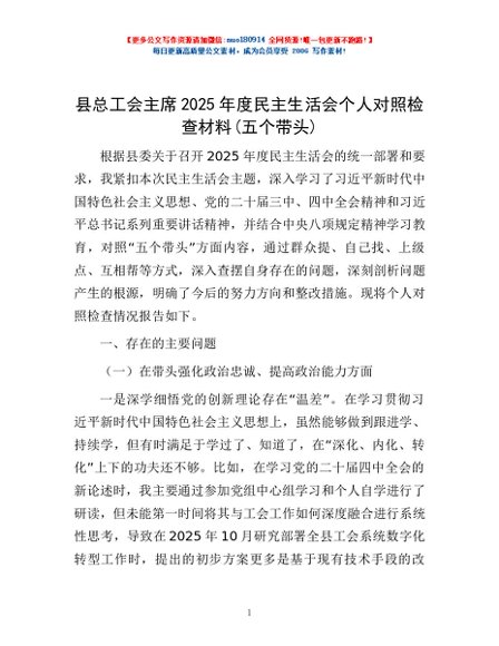 / 县总工会主席2025年度民主生活会个人对照检查材料(五个带头)
