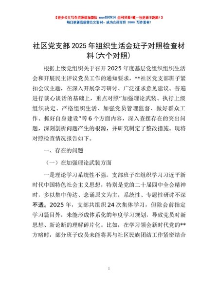 / 社区党支部2025年组织生活会班子对照检查材料(六个对照)