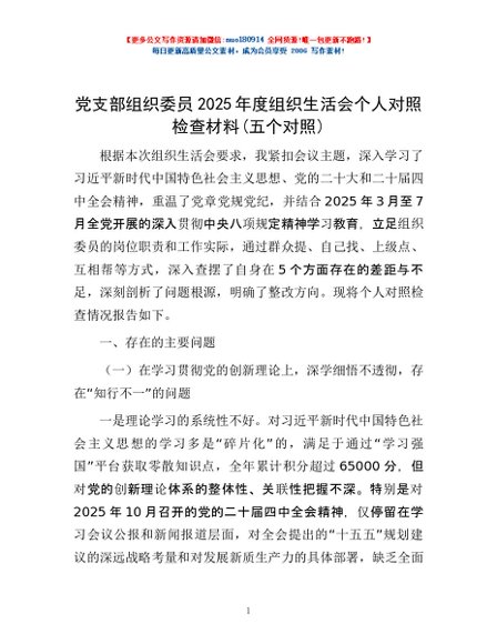 / 党支部组织委员2025年度组织生活会个人对照检查材料(五个对照)