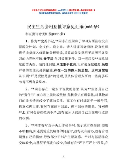 / 民主生活会相互批评意见汇编(666条)