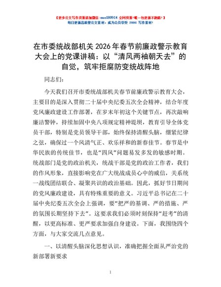 / 在市委统战部机关2026年春节前廉政警示教育大会上的党课讲稿:以“清风两袖朝天去”的自觉,筑牢拒腐防变统战阵地
