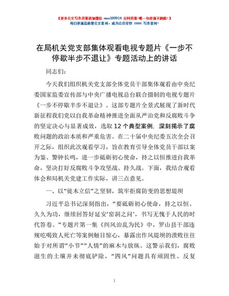 / 在局机关党支部集体观看电视专题片《一步不停歇半步不退让》专题活动上的讲话