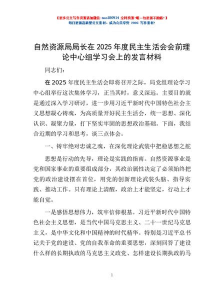 / 自然资源局局长在2025年度民主生活会会前理论中心组学习会上的发言材料