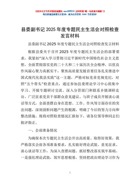 / 县委副书记2025年度专题民主生活会对照检查发言材料