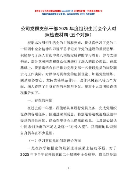 / 公司党群支部干部2025年度组织生活会个人对照检查材料(五个对照)