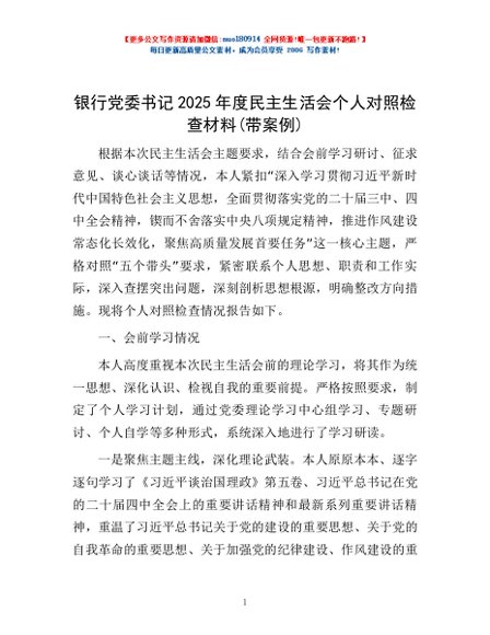 / 银行党委书记2025年度民主生活会个人对照检查材料(带案例)