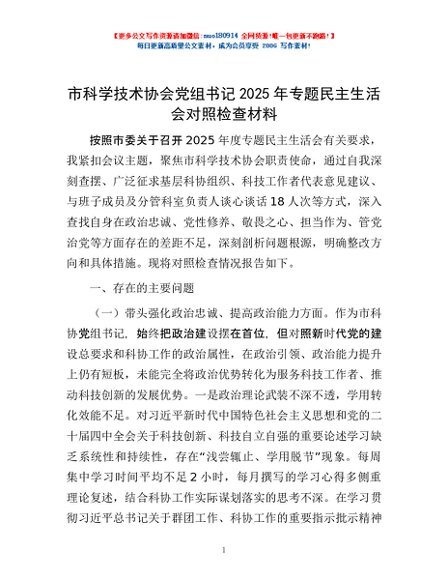 / 市科学技术协会党组书记2025年专题民主生活会对照检查材料
