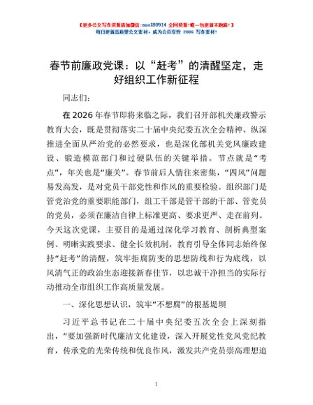 / 春节前廉政党课:以“赶考”的清醒坚定,走好组织工作新征程