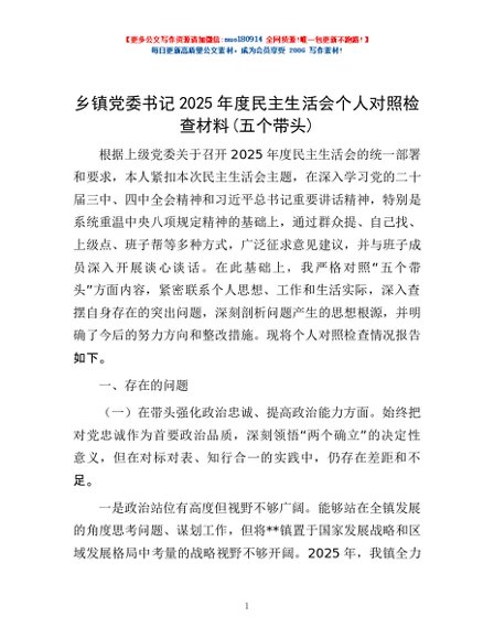 / 乡镇党委书记2025年度民主生活会个人对照检查材料(五个带头)