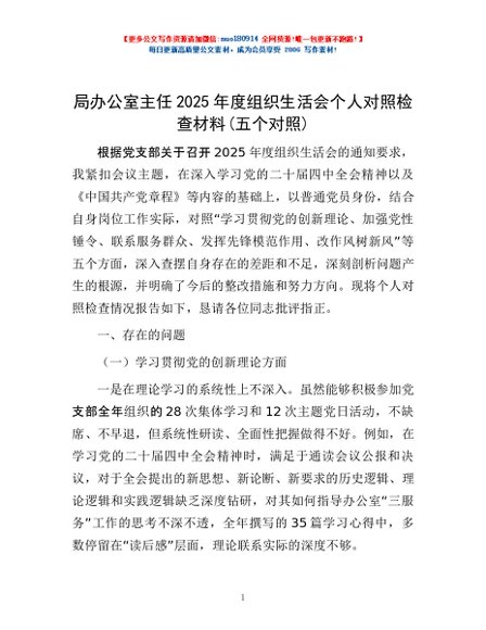 / 局办公室主任2025年度组织生活会个人对照检查材料(五个对照)