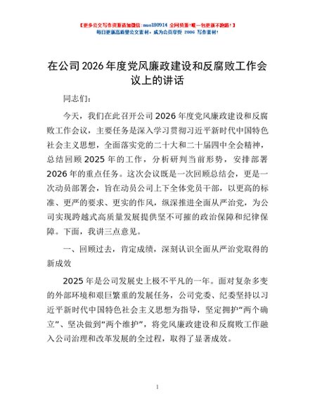 / 在公司2026年度党风廉政建设和反腐败工作会议上的讲话
