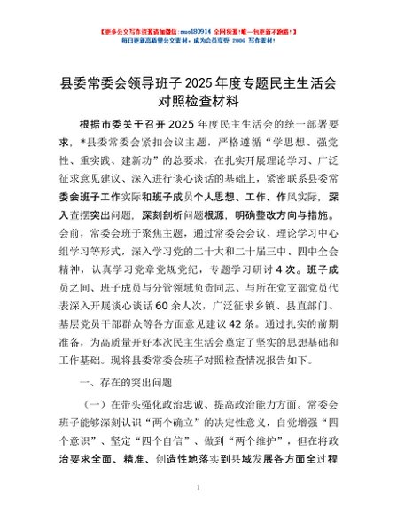 / 县委常委会领导班子2025年度专题民主生活会对照检查材料