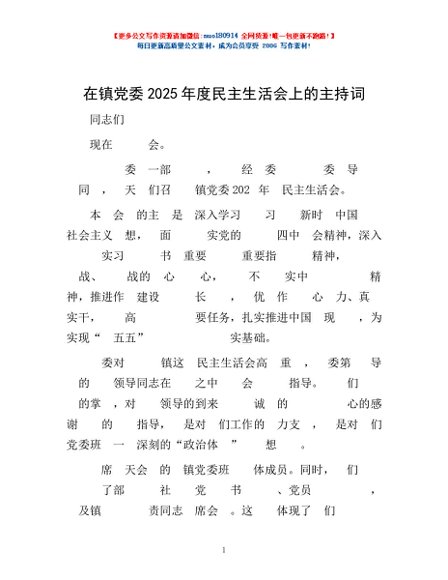 / 在镇党委2025年度民主生活会上的主持词