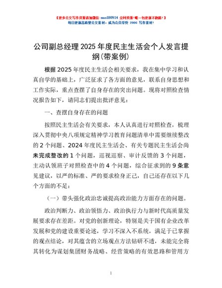 / 公司副总经理2025年度民主生活会个人发言提纲(带案例)