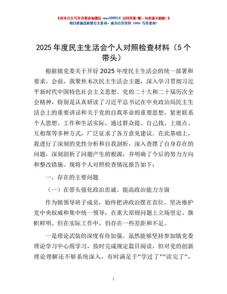 / 2025年度民主生活会个人对照检查材料(5个带头)