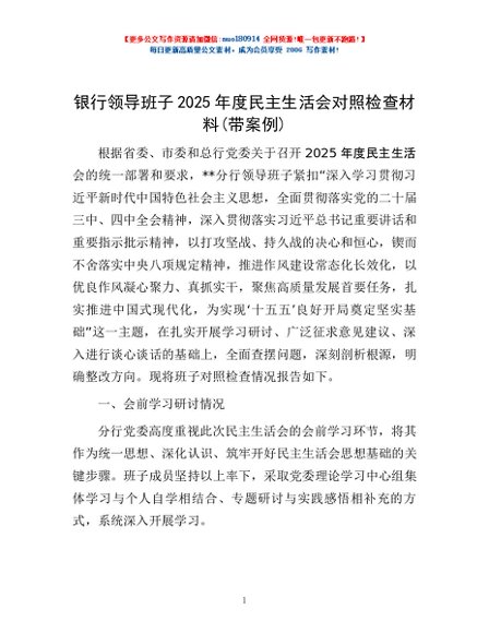 / 银行领导班子2025年度民主生活会对照检查材料(带案例)