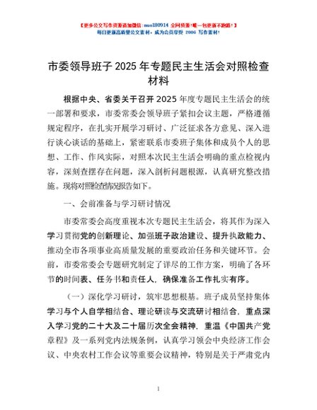 / 市委领导班子2025年专题民主生活会对照检查材料