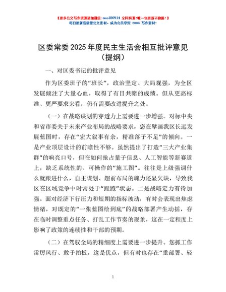 / 区委常委2025年度民主生活会相互批评意见(提纲)