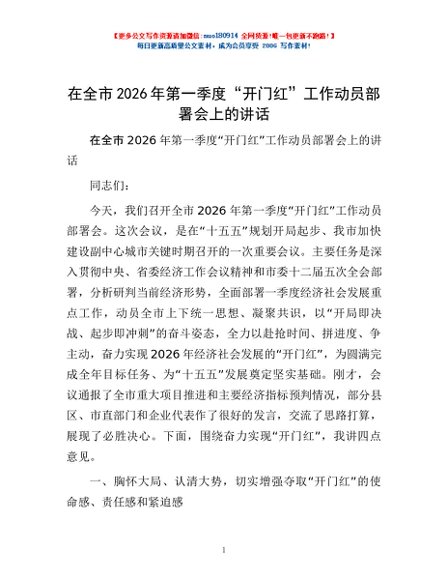 / 在全市2026年第一季度“开门红”工作动员部署会上的讲话