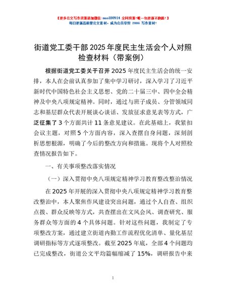 / 街道党工委干部2025年度民主生活会个人对照检查材料(带案例)