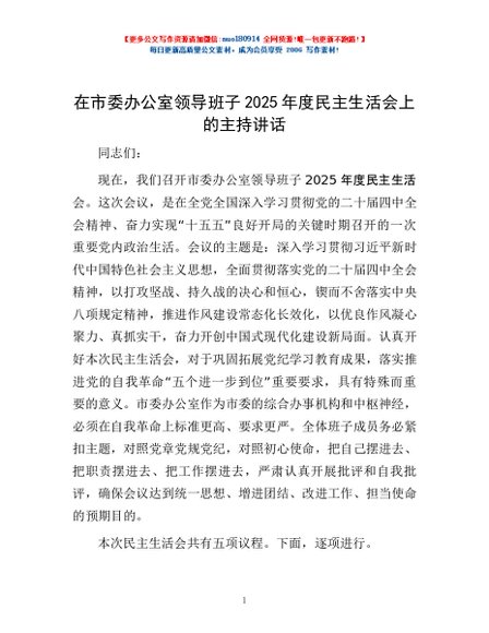 / 在市委办公室领导班子2025年度民主生活会上的主持讲话