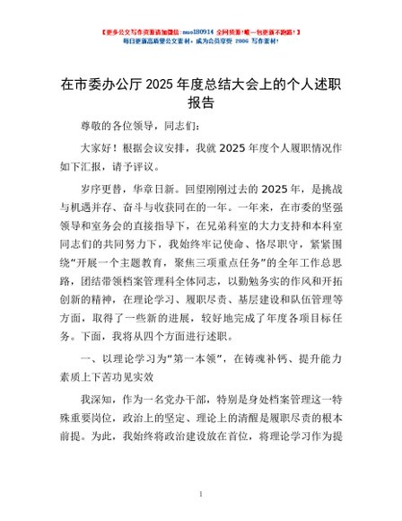 / 免费-在市委办公厅2025年度总结大会上的个人述职报告