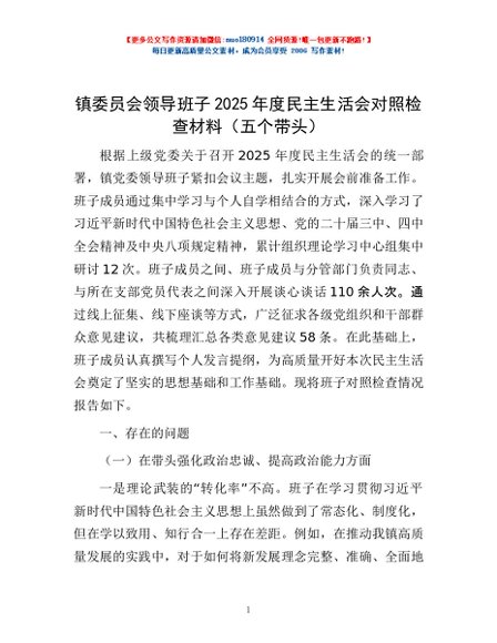 / 镇委员会领导班子2025年度民主生活会对照检查材料(五个带头)