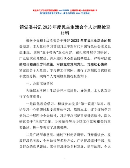/ 免费-镇党委书记2025年度民主生活会个人对照检查材料