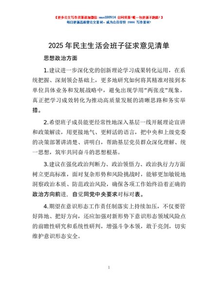/ 2025年民主生活会班子征求意见清单