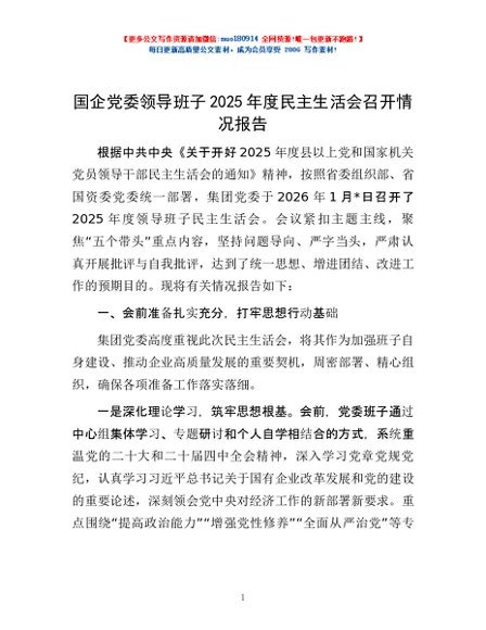 / 免费-国企党委领导班子2025年度民主生活会召开情况报告