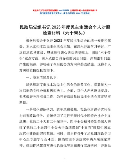 / 民政局党组书记2025年度民主生活会个人对照检查材料(六个带头)