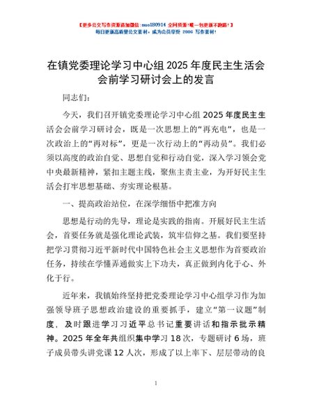 / 在镇党委理论学习中心组2025年度民主生活会会前学习研讨会上的发言