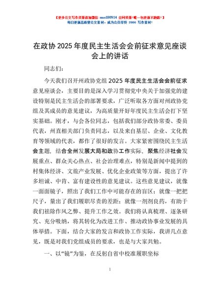 / 在政协2025年度民主生活会会前征求意见座谈会上的讲话